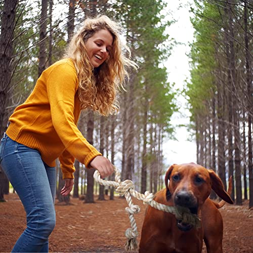 Fida Dog Rope Toys for Aggressive Chewers are perfect for large dogs who love to play tug-of-war. Made of undyed natural cotton, these toys are tough, durable, and virtually indestructible. The 29″ rope has three big knots and a handle, making it easy to grip and play with.